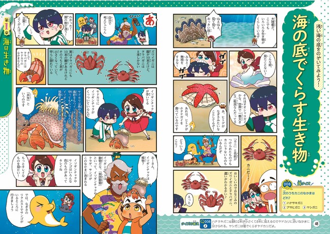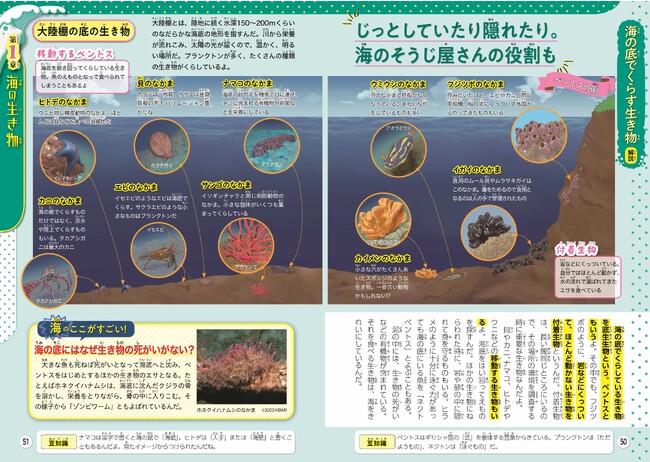 食卓にあがるような魚、クジラ・イルカなどの生き物はもちろん、200~6000mの超深海でくらす不思議な深海生物も詳しく紹介しています。