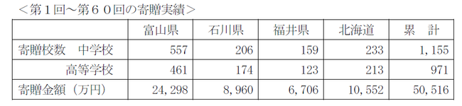 当財団の寄贈は、1963年の創立以来、本年度で60回目となります。寄贈校は北陸3県・北海道の中学校、高等学校で延べ2,126校、寄贈額累計は約5億円となりました。