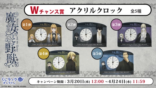 カルチュア・エンタテインメント株式会社(以下、CE)は、佐竹幸典原作、TVアニメ「魔女と野獣」(講談社刊)とコラボレーションした、ハズレ無しでキャラクターグッズがゲットできるオンラインくじ「くじラックオンライン」を2024年3月20日(水)より発売いたします。賞品はA賞~E賞まで5アイテム(全32種)となっております。さらに、くじ1枚ご購入ごとにWチャンス賞の抽選が行われ、当選した方は特別な賞品が獲得できます。