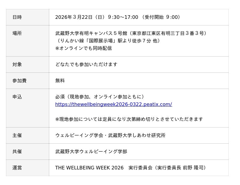 武蔵野大学ウェルビーイング学部(東京都西東京市、学長:小西 聖子)およびウェルビーイング学会は、世界幸福デーである3月20日を含む10日間にわたって開催される「THE WELLBEING WEEK 2026」の最終日の3月22日(日)に「THE WELLBEING WEEK 2026 基調講演・シンポジウム」を開催します。