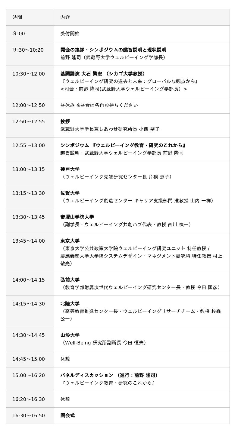 育・研究のこれから」をテーマに各大学の取り組みの発表と、パネルディスカッションを行います。本基調講演・シンポジウムを通じて、様々な視座から「幸せ」を考える機会を提供し、社会全体のウェルビーイングを高めていくことを目指します。開催方法は対面(武蔵野大学有明キャンパス)と同時にオンライン配信も予定しています。