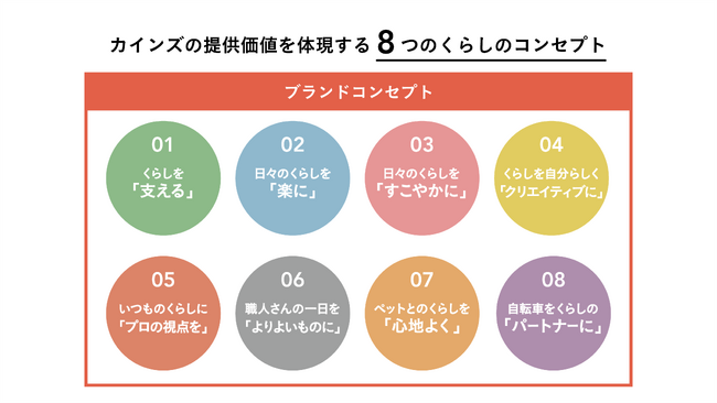 商品開発の起点は、カインズの提供価値を体現した8つのくらしのコンセプトです。そのコンセプトを元に、今回8つのプロダクトブランドを設立しました。