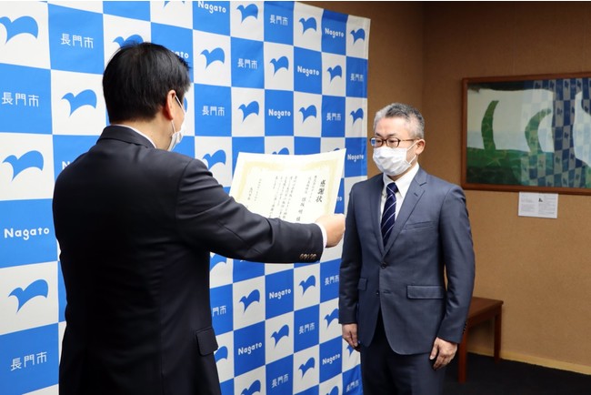 1月14日(金)山口県長門市役所にて行われた寄贈式には、当社を代表してダイナム山口長門店 ストアマネジャー(以下、「SM」)佐藤雅也、地域共生担当 新垣幸司が参加し、長門市 江原市長へ目録をお渡しいたしました。当社では、地域社会の発展に寄与する様々な活動を展開しており、これまでに宮城県名取市、山形県長井市、茨城県土浦市、水戸市、桜川市、福井県越前市、岐阜県山県市、5県7市に対して企業版ふるさと納税を実施しております。
