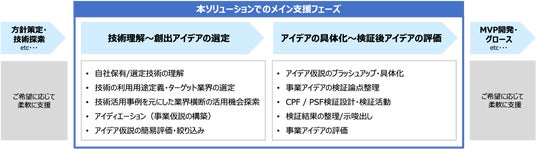 本ソリューションは、特に技術起点の事業開発に特有の課題が集中して発生しやすい事業開発の初期フェーズに焦点を当てて支援します。技術の選定、活用用途の探索、事業機会の評価などのプロセスを中心に各社の知見を体系化した独自メソッドに基づき、Relic、クニエ、NTTデータの新規事業創出プロフェッショナル人材がアクセラレーターとして、技術や業界知見者を交えた体制で一気通貫で伴走支援します。 これにより、デジタル技術の新しい利用用途と事業機会を見つけ、事業アイデアの仮説構築から検証・評価までを迅速に実施することができ、社会実装までのスピードを短縮することができます。