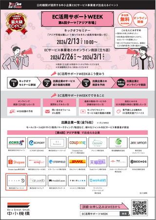 独立行政法人中小企業基盤整備機構(以下、中小機構)のEC活用支援パートナー*¹である株式会社フォーイットは、来る2024/2/26(月)~3/1(金)に開催される「EC活用サポートWEEK」へ越境EC支援企業として出展いたします。