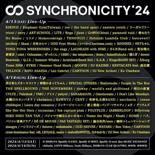『SYNCHRONICITY’24』出演アーティストから、4/13(土)は、新東京、YONA YONA WEEKENDERS、EYRIE、jizue、odolの5組、4/14(日)に、ExWHYZ、toconoma、DE DE MOUSE、fox capture plan、グソクムズ、xiangyuの6組の合計11組が出演。また、4/14(日)には、オーガナイザートークとして、主催者の麻生潤(SYNCHRONICITY)を始め、飯田仁一郎(ボロフェスタ)、野口純一(結いのおと)、野村優太(ONE MUSIC CAMP)が出演し、フェス裏側のトークセッションが行われる。MCはフェスティバルライフ編集長の津田昌太朗をメインに、Voicyの番組「ロッキンボイシー」パーソナリティのおりえってぃがサポート。音楽に加え、アーティストの生トークが楽しめる貴重な機会をお届けします。