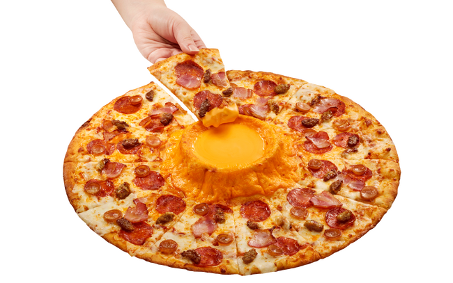 ピザの中央に火山のようにそびえ立つ濃厚なチェダーチーズソースにお肉たっぷりのジューシーなギガ・ミートをディップして食べることができる新感覚ピザ。