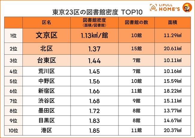 区ごとに面積が異なるため、区の面積を区内の図書館数で割った「図書館密度」を算出しました。その結果、図書館密度が最も高い区は、面積が23区中4番目で10館ある文京区(1.13平方キロメートル/館)でした。2位は15館ある北区(1.37平方キロメートル/館)、3位は台東区(1.44平方キロメートル/館)、4位は荒川区(1.45平方キロメートル/館)、5位中野区(1.56平方キロメートル/館)と城北エリアから3区が入りました。