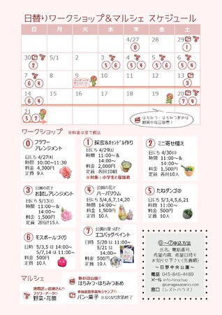 花や緑による街の魅力向上や、自然環境へ関心を抱いていただくことを目的に、期間中の土日祝日に日替わりで、園で咲いた花を使用したハーバリウムやフラワーアレンジメント、葉っぱでペイントするエコバッグなどのワークショップを開催。さらに、横浜産はちみつや野菜・花苗・パンなどを販売するマルシェもお楽しみいただけます。