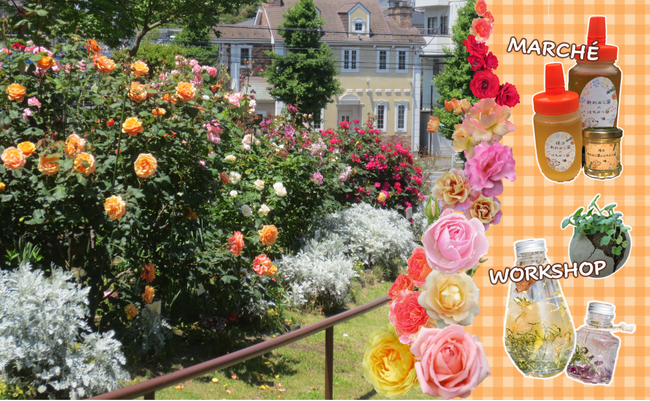 約70種140株のバラ園が見頃を迎えるのにあわせて、園内で咲いた花を使用したハーバリウムやフラワーアレンジメント、葉っぱでペイントするエコバッグなどのワークショップを土日祝日に日替わりで開催。さらに、横浜産はちみつや野菜・花苗・パンなどのマルシェもお楽しみいただけます。
