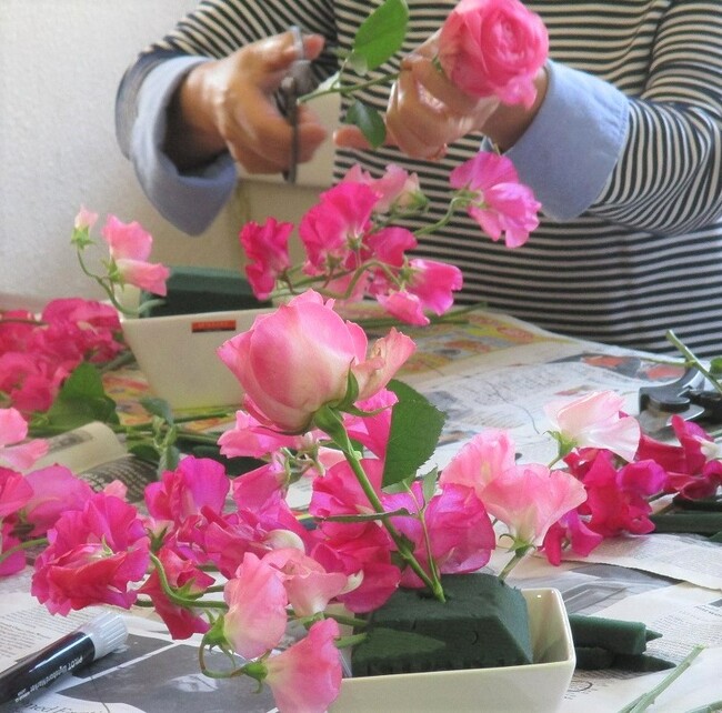 公園で咲いたバラなどの花を使ってアレンジメントを手づくりします。アレンジメント教室主宰の講師がやさしく教えてくれるので、初めての方でもお気軽にご参加ください。