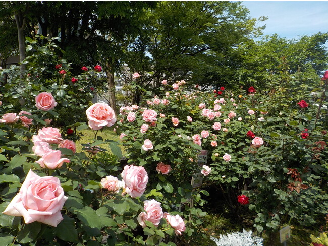神奈川県横浜市にある横浜市日野中央公園は、芝生広場、テニスコート、野球場を完備し、幅広い世代の市民の方が集う公園です。園内には約70種140株の「バラ園」があり、地域のボランティアの方々と管理を行っています。横浜市が2009年の開港150周年を記念して開発した「はまみらい」、平和のシンボルとして名付けられた「ピース」などの華やかなバラが、4月下旬から5月にかけて順次見頃を迎える見込みです。