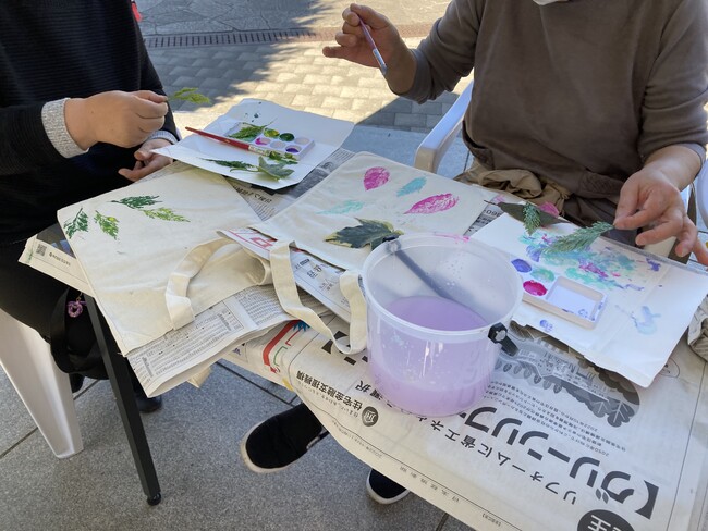 公園で採れた葉っぱにアクリル絵の具を塗って、エコバックにスタンプします。丸、ギザギザ、ハート型などの葉の形や葉脈など、植物の個性に気づくステキな作品づくりです。