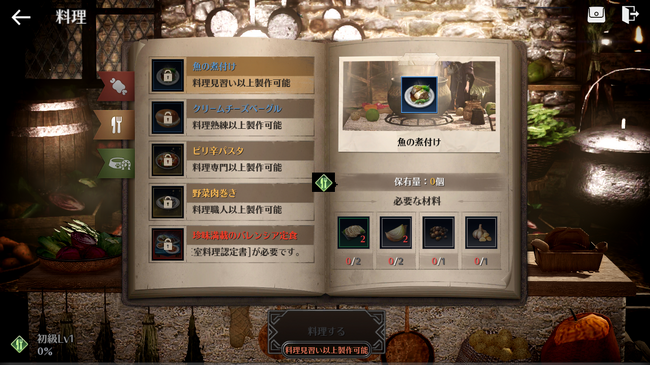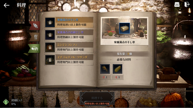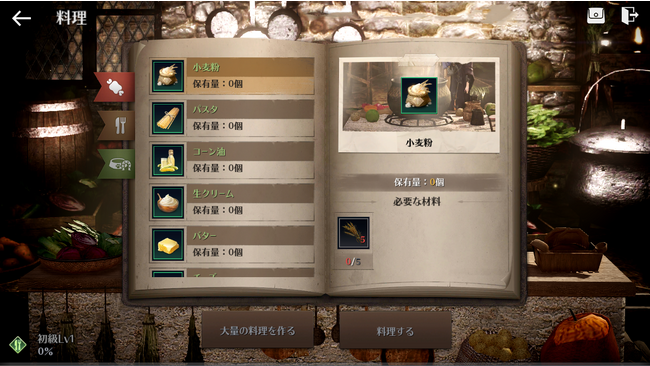 料理は、領地内の農場で品種改良された種を栽培もしくは家畜の収穫/と畜で獲得したアイテムを材料に利用できます。 一部材料はメディア商人会納品のお礼や、料理製作を通じて獲得できます。