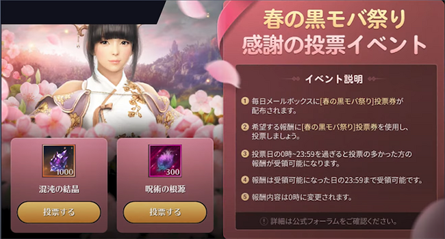 イベント期間中の毎日0:00にイベント参加に必要なアイテム「[春の黒モバ祭り]投票券」がメールボックスへ発送されます。