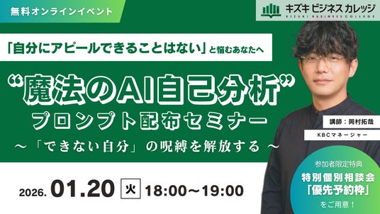 就労移行支援事業所・キズキビジネスカレッジ(KBC)は、2026年1月20日(火)に、AIを使ってできない自分の呪縛を解放して、できる自分を再発見するための無料オンラインセミナーを開催します。