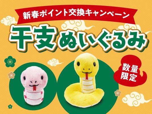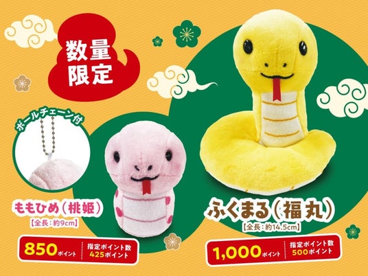サミットは、年始恒例企画としてオリジナルの干支ぬいぐるみをサミットポイントで交換できるキャンペーンを行います。2025年は巳のぬいぐるみ、黄色の「ふくまる(福丸)」とピンクの「ももひめ(桃姫)」が登場します。