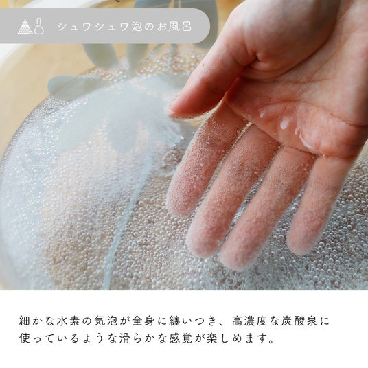 入浴剤の特徴この入浴剤の特徴としては、長年注視してきた高濃度な水素入浴剤の開発に成功したことが言えます。本品では水素濃度を表すppmの値を一般的な水素入浴剤の約4倍(※当社比較)にすることで、まるでシャンパンの泡に包まれているような贅沢な入浴体験を実現しています。