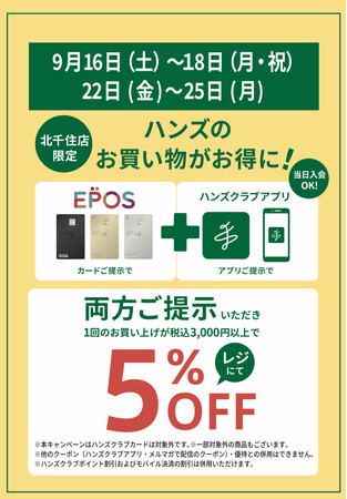 期間中、エポスカードとハンズクラブアプリを両方ご提示いただき、1回のお買い上げ金額が税込3,000円以上でレジにて5%オフいたします。