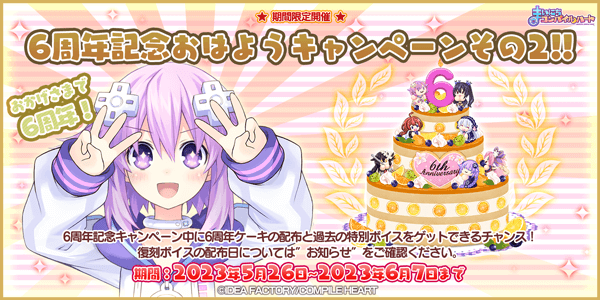 アイディアファクトリー株式会社の子会社である株式会社コンパイルハートは、本日5月26日(金)に、リリース6周年を迎えるスマートフォン向けアプリ『まいにちコンパイルハート』において、『超次元ゲイム ネプテューヌ GameMaker R:Evolution』とのコラボ衣装実装を発表しました。また6周年を記念したキャンペーン第2弾も本日より開始しました。