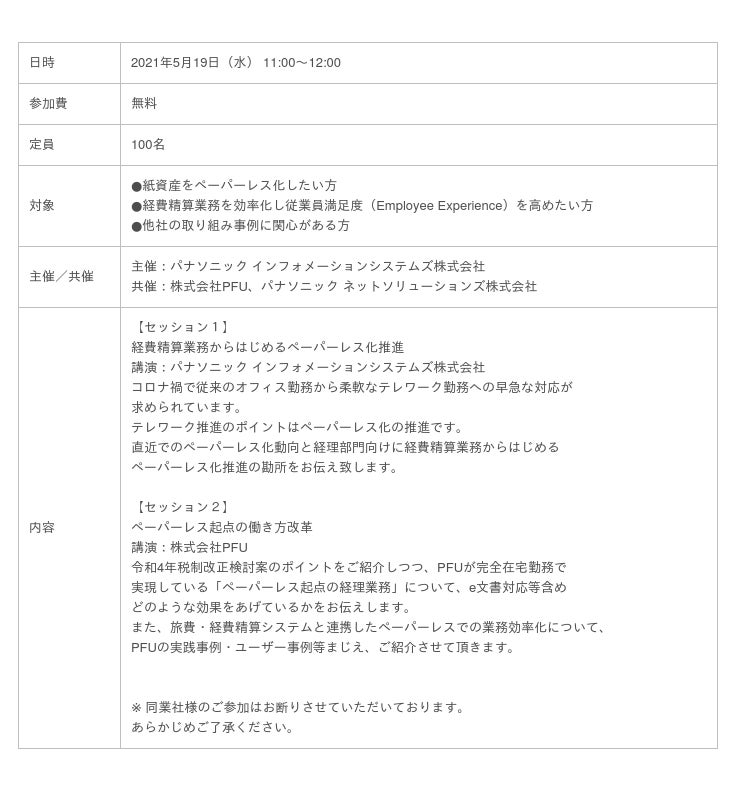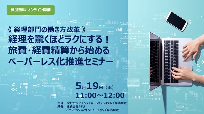 パナソニック インフォメーションシステムズ株式会社は、2021年5月19日(水)に 「旅費・経費精算システム」と「ペーパーレスシステム」にフォーカスしたオンラインセミナーを開催します。