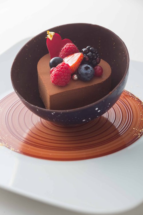 タワーズレストラン「クーカーニョ」:【バレンタインフェア】では、優雅なバレンタインのひとときを演出する特別ディナーをお届けいたします。黒トリュフの芳しいプロヴァンス料理のフルコースをご堪能いただいた後は、炎を操るフランベでの演出を取り入れたスペシャルデザートをご用意。ショコラとベリーの贅沢な味わいをおふたりでお楽しみいただけます。