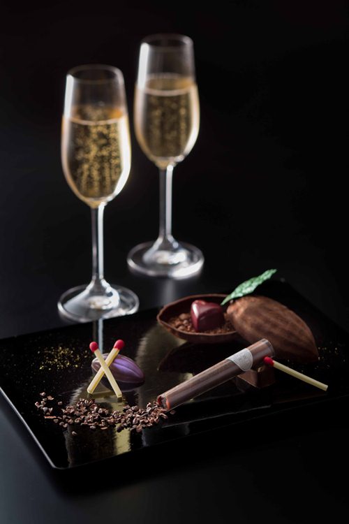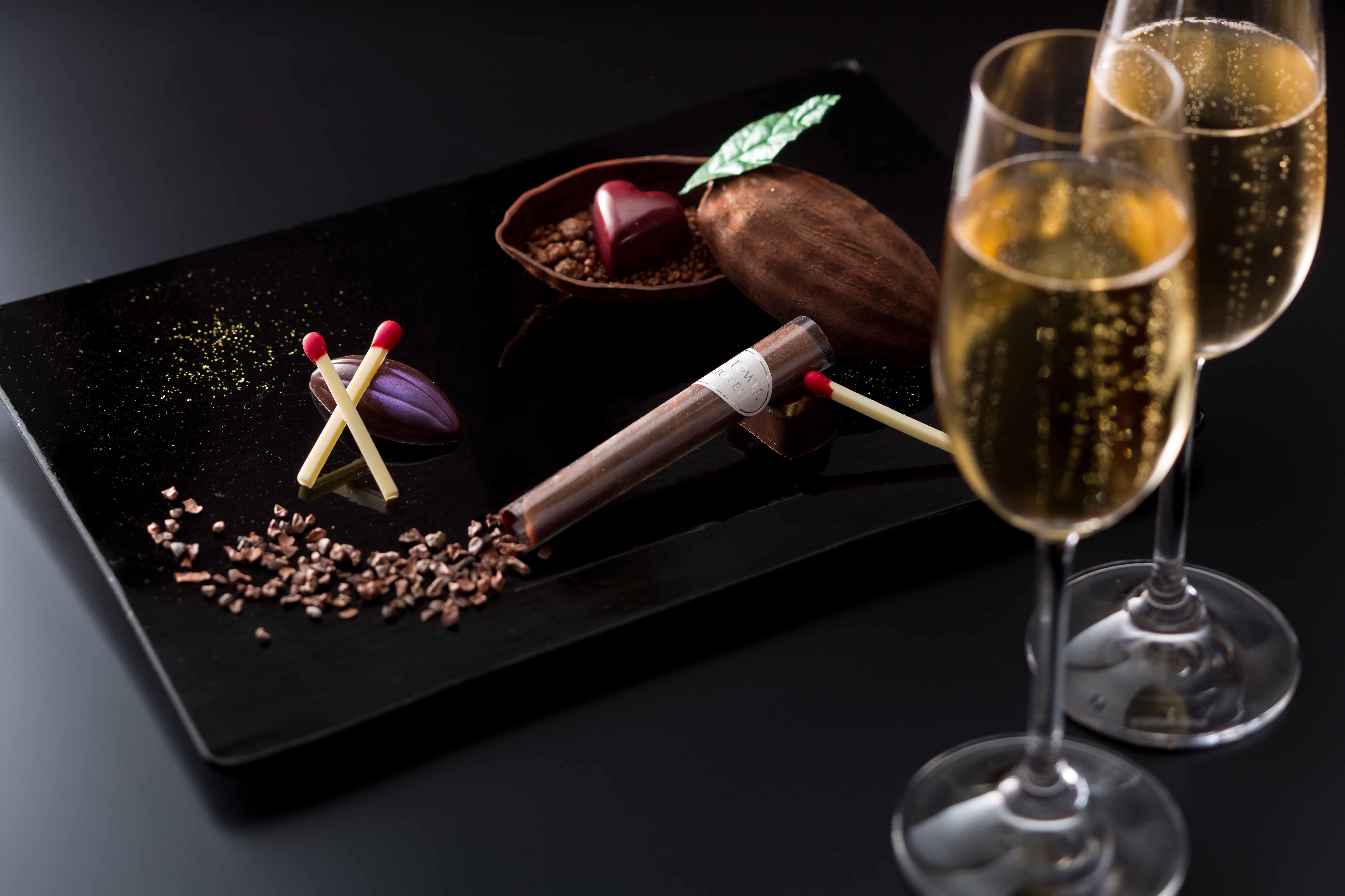 タワーズバー「ベロビスト」:【バレンタイン カクテルショコラ】では「お酒とともに楽しめる」をテーマにバーテンダーとパティシエがアイデアを出し合い考案した大人のためのバレンタインチョコレートをご用意いたしました。ソムリエセレクトのシャンパンやバーテンダーおすすめのカクテルとのマリアージュをご提案してまいります。