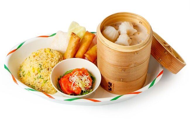 神戸南京町に本店を構える中華飲茶店「皇蘭」による、点心3種に春巻きとデカ盛りチャーハンがセットになった、大満足のオリジナルプレート。3段のセイロタワーを撮影した後は、ボリュームたっぷりの飲茶を仲良くシェア。