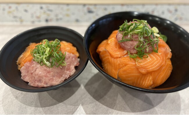 ローストビーフが通常の3倍のった山のようなシルエットのローストビーフ丼(1kg ※通常330g)と、サーモンが通常の4倍、ネギトロが2倍のった海鮮丼(820g ※通常360g)。満足感もメガ級の、シェアサイズの丼ぶりです。2種の丼ぶりをシェアで食べ比べるのもおすすめ。