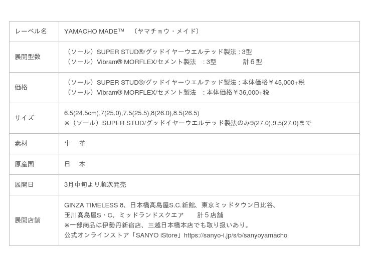 三陽商会が展開する紳士靴ブランド「三陽山長」は、ファッションに「本物」と「遊び心」を追求する大人に向けて、新レーベル「YAMACHOMADE(TM)(ヤマチョウ・メイド)」を2020年春夏シーズンよりスタートいたします。ソールにはヴィブラム社と共同開発したソール「SUPER STUD(R)(スーパースタッド)」などを用い都市環境の様々な路面状況にも適応できるよう設計。ラスト(木型)は日本人の平均寸法に合わせ長時間の歩行を想定しストレスの軽減を目的に設計しました。底付けには主にグッドイヤーウエルテッド、マッケイなどのリペア可能な製法を採用。リペアを可能にすることで長く愛用できるようにしました。