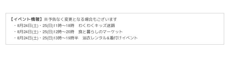 メインイベントは、8月24日(土)・25日(日)に開催の「わくわくキッズ迷路」、「食と暮らしのマーケット」、「浴衣レンタル&着付けイベント」。
