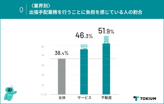 ・不動産とサービス業で、出張手配を負担に感じる人が多い傾向。全体(38.4%)より約10ポイントも高い結果に。