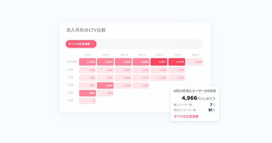 オンライン、店舗の購買データなど1st Party Dataと広告データを統合。LTV軸で広告投資対効果の把握が可能です。