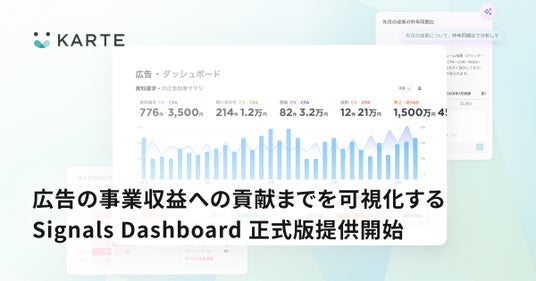 株式会社プレイド(東京都中央区:代表取締役CEO 倉橋健太)は、1st Party Dataの活用により広告効果改善を実現する「KARTE Signals(カルテ シグナルズ)」のダッシュボード機能である「KARTE Signals DashBoard」(以下、Signals DashBoard とする)にAIによる分析機能などを拡充し、正式版として提供開始します。