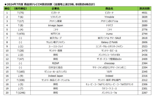 SMN株式会社(本社:東京都品川区、代表取締役社長:原山 直樹、以下SMN)は、2024年7月度の全国地上波25局、BS放送6局にて放送されたテレビCMの放送回数を調査・集計しましたので、お知らせいたします。