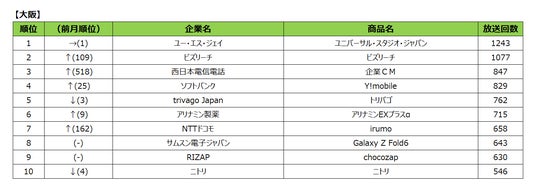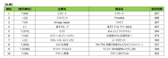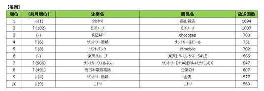 季節商材としては、夏休み・お盆休みに伴い、4位のtrivago Japan「トリバゴ」、7位の楽天グループ「楽天トラベル サマーSALE」といった旅行サイトや、9位のユー・エス・ジェイ「ユニバーサル・スタジオ・ジャパン」といった宿泊サイト・レジャー施設のテレビCMが上位にランクインしています。