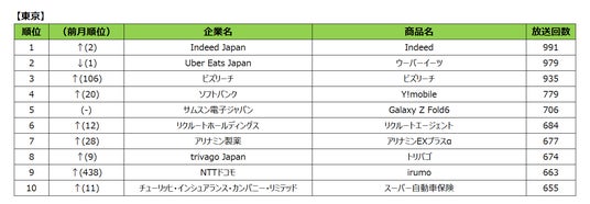 同じく求人サービスを展開するIndeed Japan「Indeed」は商品別ランキングでは16位でしたが、東京では1位となっており、都市部で集中的なプロモーションを実施していたことが伺えます。