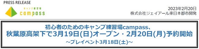 株式会社ジェイアール東日本都市開発は、ニューウェルブランズ・ジャパン合同会社コールマン事業部及び伊藤忠テクノソリューションズ株式会社の協力のもと、「キャンプ練習場 campass」を3月19日(日)より秋葉原の高架下でスタートします。