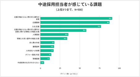 ※中途採用活動で課題に感じるものについて上位3つまでの選択形式で回答を取得し、ポイント換算を行い、100人あたりのポイント数で比較