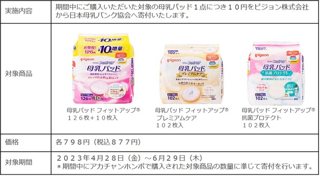 このキャンペーンは、アカチャンホンポで購入された対象商品(母乳パッド)の売上げの一部を、ピジョン株式会社が日本母乳バンク協会へ寄付いたします。赤ちゃん本舗は、本キャンペーンを通じて、妊娠期や産後のママやパパへの母乳バンクの理解と認知拡大の啓発活動に取り組みます。