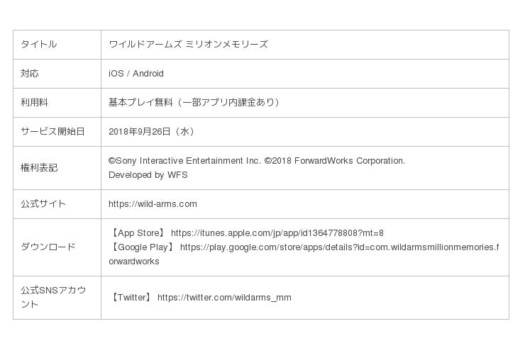 『ワイルドアームズ ミリオンメモリーズ』は、シリーズのゲームデザインを手掛けてきた金子彰史が制作総監修を務め、本作オリジナルのキャラクターのほか、シリーズから歴代の主人公をはじめとするキャラクターたちが登場し、惑星ファルガイアを舞台に魅力的なキャラクターたちが織りなす新しい物語を描きます。また衝撃的なプロローグで始まるドラマティックな物語とともに、新しい試みを積極的に取り入れてきたシリーズの良さと、スマートフォンならでは操作性を活かした爽快感のあるアクションバトルをお楽しみいただけます。