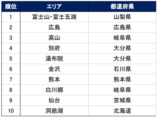 インバウンド観光客の人気エリアは富士山・富士五湖や高山が中心。