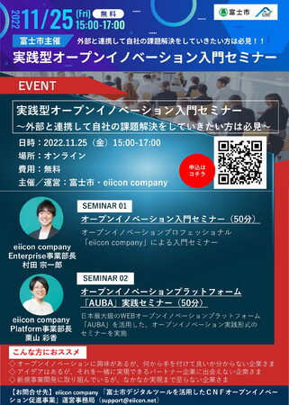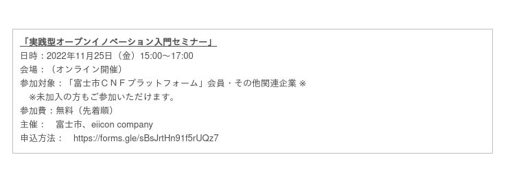 本事業の核となる取り組みとして、2022年11月25日(金)、「富士市CNFプラットフォーム」会員・その他関連企業を対象に、自社課題の解決手段としてのオープンイノベーションを知っていただくための「実践型オープンイノベーション入門セミナー」を開催いたします。