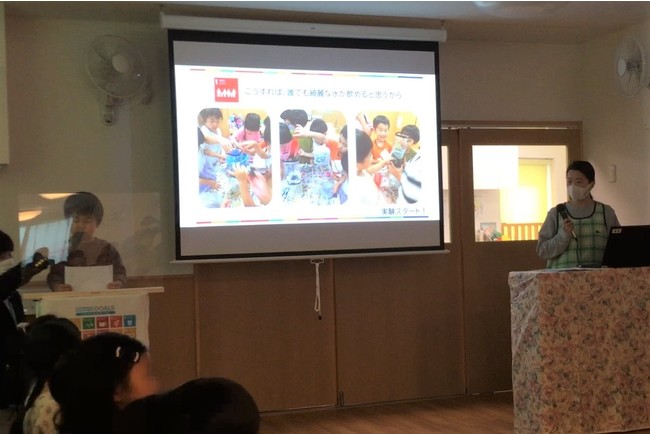 大倉山園の年長組の園児11人は、「水質汚染について考える水のろ過実験」や「食品ロスを減らすコンポスト」、「男の子・女の子という性別の固定概念をなくすワーク」など、13の取り組みを実施し、SDGsについて楽しく学んできました。この日は保護者様も参観し、園児たちはスライドを使って一人ずつ、SDGsについて学んだことや印象に残ったことを発表しました。