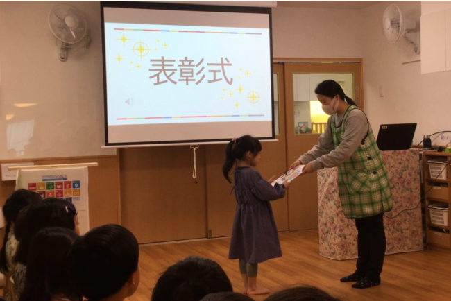発表会の後には、先生から園児一人一人に向けて言葉をかけながら、SDGsの取り組みを振り返るアルバムと表彰状を授与しました。