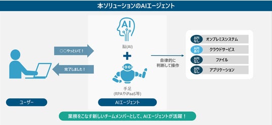 本ソリューションは、AIがRPAロボットを手足のように動かすAIエージェントの活用に向けて、ノーコードやローコードでのAIエージェントの導入教育から開発、運用までを支援するものです。AIとRPAロボットが連携することで、さまざまなクラウドサービスに加え、APIを持たない社内のオンプレミスシステムの操作も自動化することができます。さらに、他社が提供する複数のAIエージェント同士を連携させることも可能です。これらにより、まるで部下が日常の業務を遂行するようになるため、企業は、創造的な業務やイノベーション創出に人財を集中させ、競争力向上につなげられます。