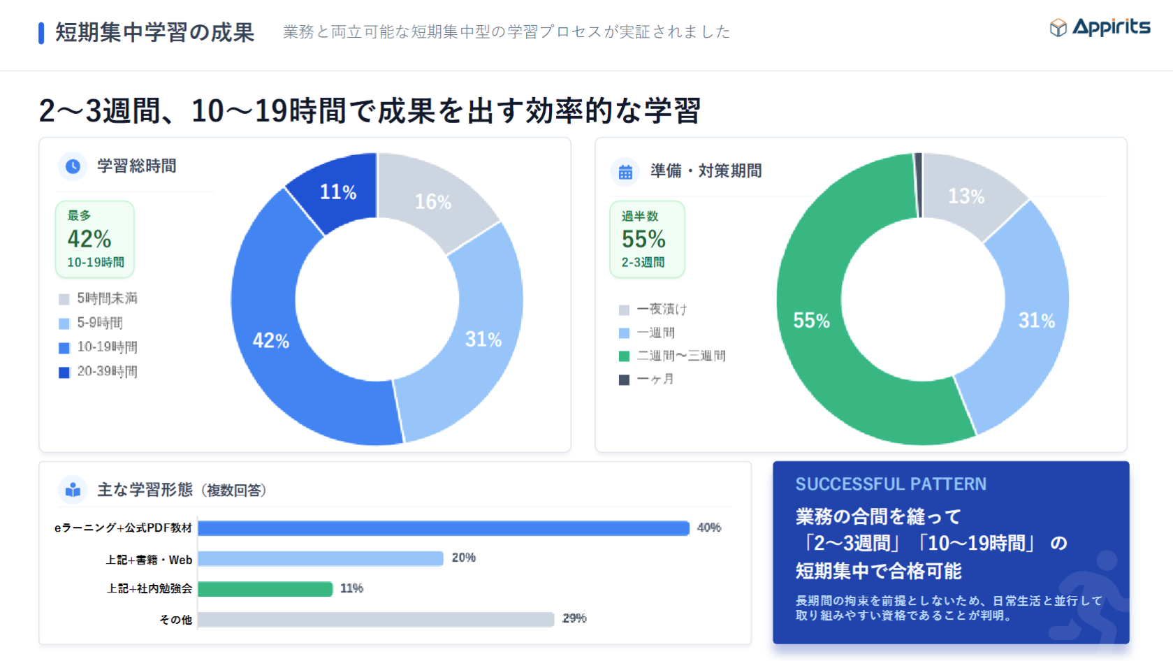 アピリッツでは、これらの課題に対して、試験勉強の期間を「短期に限定し集中する環境作り」、さらに社内での「勉強会」「資格支援制度」を合わせて実施いたしました。
