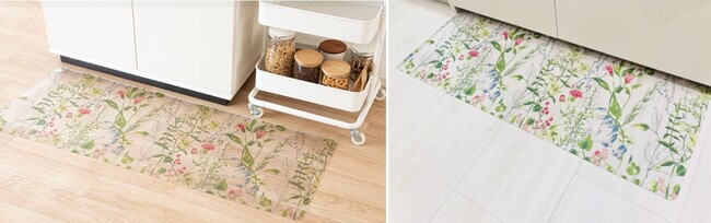 「マットがないほうがキッチンがスッキリするけれど、水はね等の汚れが気になる」というお客様の声より、透明のビニールにボタニカル柄をあしらったキッチンマットを販売開始いたしました。