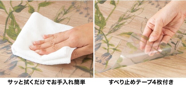 ファブリックではないため洗濯不要、サッと拭くだけでお手入れ簡単です。また、すべり止めテープ4枚付いており、滑りにくく安心してお使いいただけます。
