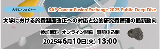 株式会社ニーズウェル(本社:東京都千代田区、代表取締役会長兼社長 船津浩三)は、2025年6月10日(火)開催の共催オンラインイベント「SAP Concur Fusion Exchange 2025 Public Deep Dive / 大学における旅費制度改正への対応と公的研究費管理の最新動向」で登壇しますのでお知らせします。